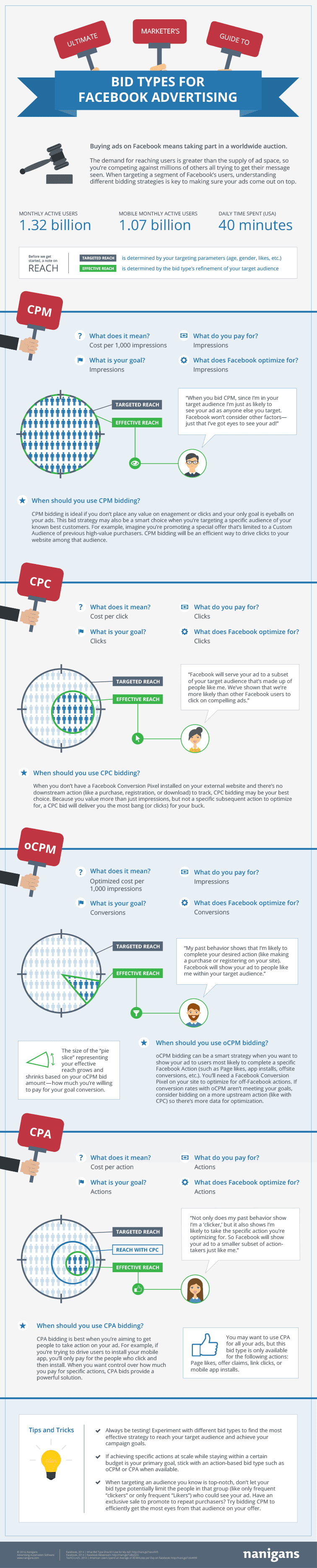 When creating ads, one of the most important things to understand is the bidding process–and half the battle is understanding all the terminology. One of Facebook’s Strategic Preferred Marketing Developers, Nanigans, has put together a fantastic infographic that helps explain and clarify the different ways to bid on Facebook as well as the different terms. It’s a great guide for anyone managing Facebook ads for clients.